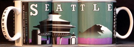 An interesting thing happened today. As I was walking home from the Olive Way Starbucks, I stumbled upon a nearby garage sale. And I noticed several coffee mugs on a table. Even at a distance, I could see that one of the mugs appeared to be a Seattle city series mug produced by Starbucks. I picked it up. Lo and behold, I was stunned to see that it was the rare “mistake” mug from 2003. I had onlyheard about this mug but never actually seen one before. It’s extremely rare.
