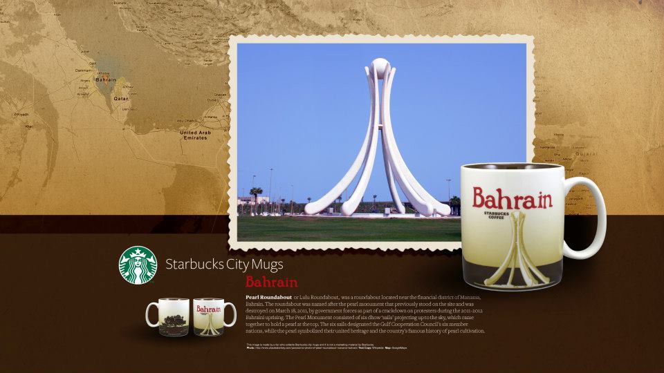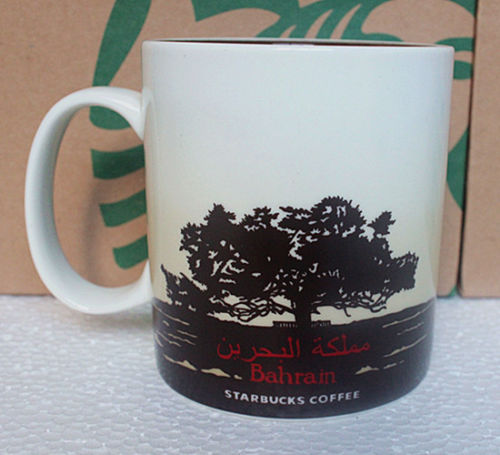 This might is probably the rarest of the two Bahrain mugs. I was stationed in Bahrain back in 2010 -2011. This was during the Arab spring uprisings. During the protest, the Pearl monument (Pictured in the above mug) located at the Pearl Roundabout at the heart of Manama Bahrains financial district was the center of the demonstrators protests and it was their defining monument. The Bahraini government tore down the monument in March of 2011 to discourage the protests and in hopes of ending the demonstrations. Once the monument was removed the Bahraini government ordered all depictions of the moneument be removed from anything and everything and made it illegal for people to sell items with the monument on them. Shortly after the second of the two Bahrain mugs was created and sold at Starbucks within the country.